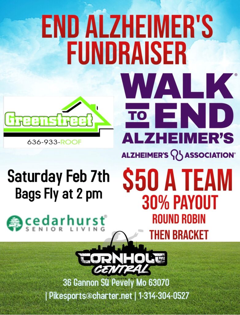 Walk to End Alzheimer’s Saturday, February 7th at Cornhole Central in Pevely, MO. It’s $50 per team with a 30% payout for the tournament winners. There will be a silent auction and 50/50 raffle and food and drinks for purchase. You don’t have to play to come support the cause and have a good time. 😊No advance RSVP necessary – just pay at the door if you want to play – https://www.facebook.com/share/1CoppqBmst/